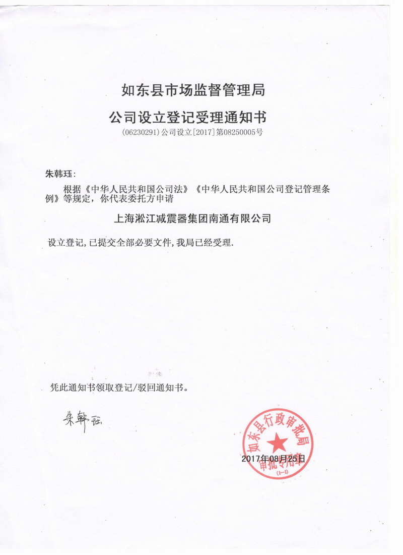 上海淞江減震器集團南通有限公司準予設立登記通知書